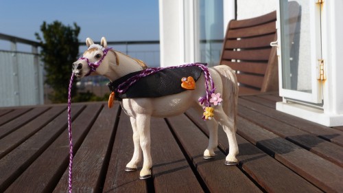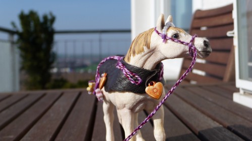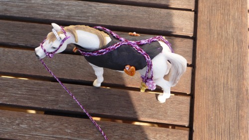 Kožená ,pošitá fialovými pletenými provázky. Zboku má srdíčka a po dvou visících kytičkách na každé straně. Je zajímavá tím , že vpředu je na knoflík. Ohlávka je zdobená korálkovou čelenkou